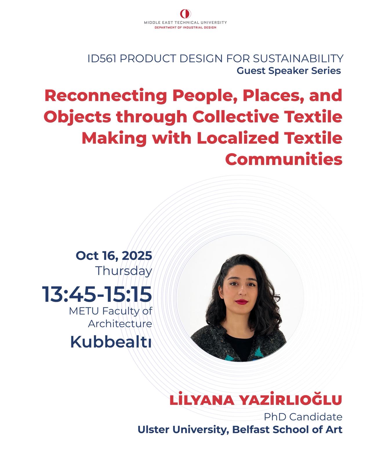 Lilyana Yazirlıoğlu, ID561 Sürdürülebilirlik için Ürün Tasarımı dersi kapsamında "Yerel Tekstil Topluluklarıyla Kolektif Tekstil Yapımı Yoluyla İnsanları, Yerleri ve Nesneleri Yeniden Bağlamak" başlıklı bir seminer verecektir. Seminer, 16 Ekim 2025 Perşembe günü saat 13.45'te Mimarlık Fakültesi Kubbealtı'nda gerçekleşecektir. Katılmak isteyen herkes davetlidir.