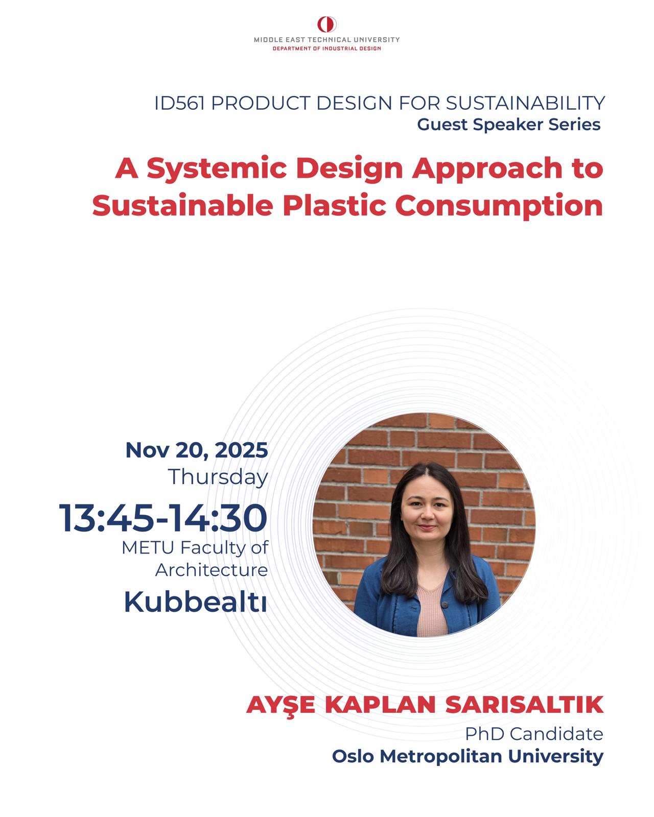 As a part of the ID561 Product Design for Sustainability course, Ayşe Kaplan Sarısaltık will give a seminar titled "A Systemic Design Approach to Sustainable Plastic Consumption". The seminar will take place on Thursday, 20 November 2025, at 13:45-14:30 in the Kubbealtı Hall of the Faculty of Architecture. Everyone interested is welcome to attend.