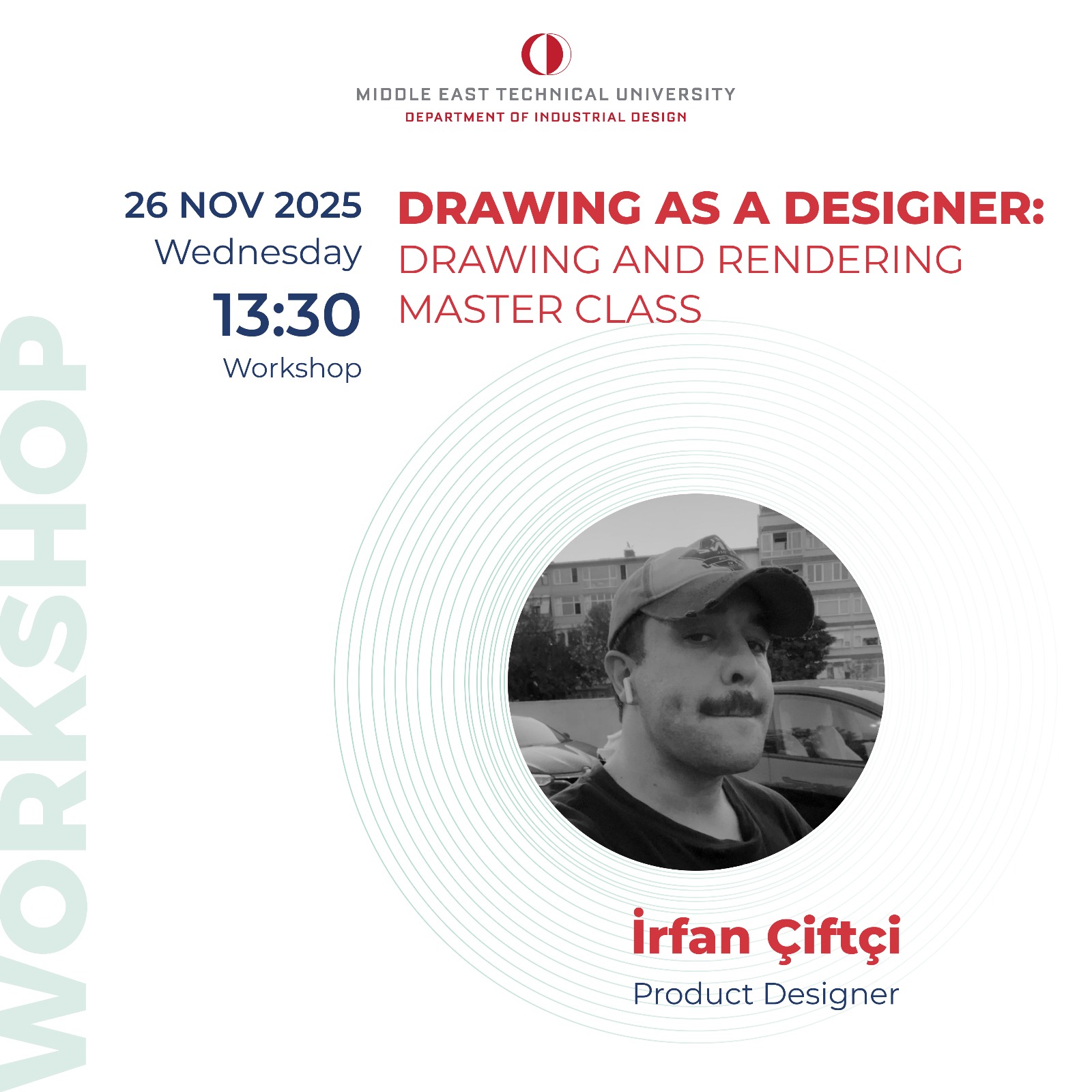 On 26 November 2025, the workshop "Drawing as a Designer: Drawing and Rendering Master Class," led by İrfan Çiftçi, will take place as part of the ID211 Design Communication III course. The workshop will provide a hands-on exploration of how drawing can serve as a tool for thinking, inquiry, and expression within the design process. Participants will be able to practice rapid sketching, form development, ideation techniques, and rendering methods. The workshop is open to students from all class levels.